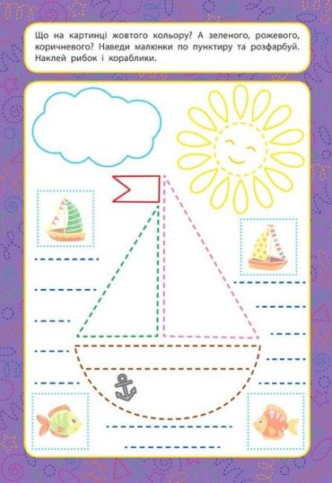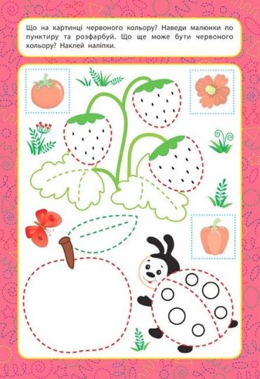 Це видання допоможе дитині запам’ятати назви кольорів. Виконуючи завдання, малюк потренується визначати колір предмета, наведе пунтирні лінії, розфарбує малюнки та попрацює з наліпками. Таким чином дитина підготує руку для майбутньої роботи з прописами для дошкільнят.