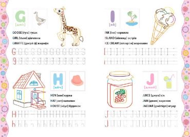 Завдяки цьому виданню дитина познайомиться з буквами англійського алфавіту, навчиться їх писати, запам’ятає їхні назви та графічні образи, почне опановувати навички читання англійською мовою, зможе скласти перші англійські слова та розважитись, розфарбовуючи ілюстрації.