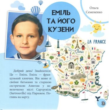Відкривши цю книгу, ви розпочинаєте мандрівку по трьох країнах світу Франції, Тунісу і Україні. Ви завітаєте в гості до трьох хлопчиків, що живуть у цих країнах, побачите їх школи, як вони проводять вільний час, святкують свої свята і навіть їх меню.