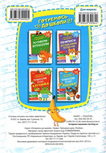"Тренуємо руку. Лінійка" - це робочій зошит із серії "Готуємось до школи". Він містить вправи з написання різноманітних елементів на аркуші в лінійку за поданим зразком.Матеріал у зошиті розташований від простого до складного. Ігровий сюжет та вірші зацікавлять дитину, а пальчикова гімнастика допоможе у виконанні вправ.Написання елементів на аркушах в клітинку радимо здійснювати паралельно з роботою у зошиті "Тренуємо руку. Клітинка".