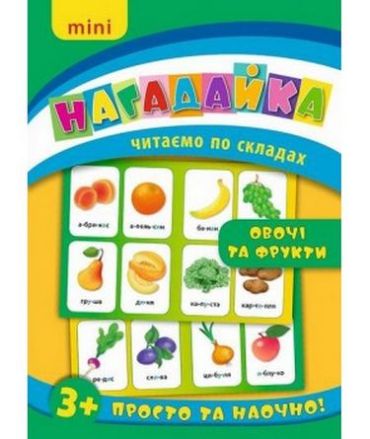 Це видання познайомить малюка з назвами овочів і фруктів. Зручний невеликий формат, слова, які поділені на склади та подані в алфавітному порядку, наочна форма подання матеріалу допоможуть дітям швидко й легко опанувати нові знання. Видання призначене для спільної роботи дорослих з дітьми від трьох років.