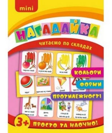 Це видання познайомить малюка з назвами кольорів, формами та словами з протилежними значеннями. Зручний невеликий формат, слова, які поділені на склади, та наочна форма подання матеріалу допоможуть дітям швидко й легко опанувати нові знання. Видання призначене для спільної роботи дорослих з дітьми від трьох років.