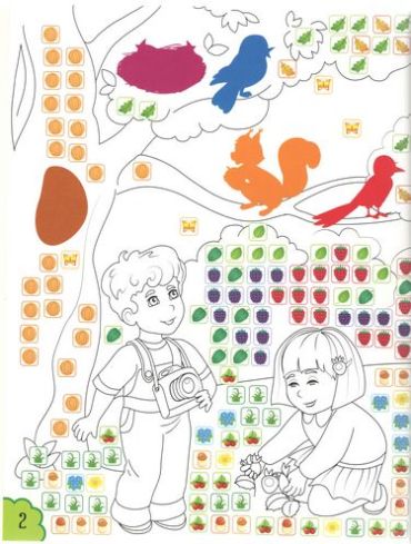 Розгорнувши перший розворот, діти одразу ж потрапляють на екскурсію сонячною галявиною заповідника. Правда, для того, щоб на галявинці по-справжньому виграло сонечко, малюкові необхідно її «оживити».