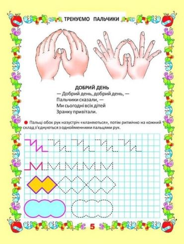 Розпочавши з пальчикових ігор і вивчення віршиків, малюк поволі перейде до опанування складніших навичок: навчиться рахувати, обводити по пунктиру геометричні фігури, вивчить абетку. Коли ж пройде цей етап, зможе потренуватися писати по пунктиру літери й цифри, а також малювати різні предмети за зразком.