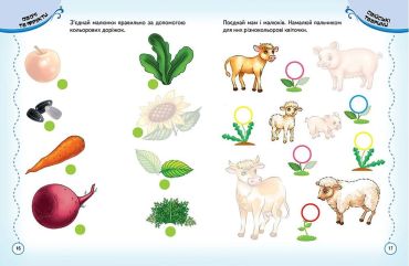 - являє собою для 2-річного малюка, перш за все, захоплюючу гру. Для цього в книжку вклеєні 96 різнокольорових наліпок іграшок, тварин, рибок, квіток, ягід. Є навіть кавун і соснова шишка!