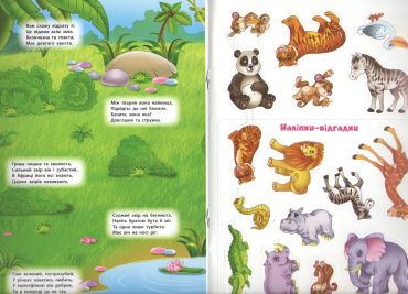 Це видання призначене для розвитку дрібної моторики, уваги, уяви та кмітливості малюків. Загадки у віршах спонукатимуть дитину шукати відповіді серед наліпок і клеїти їх до білі ілюстрованої панорамки.