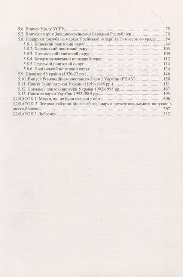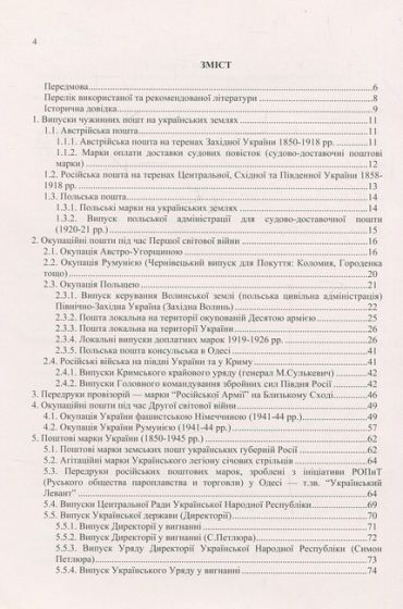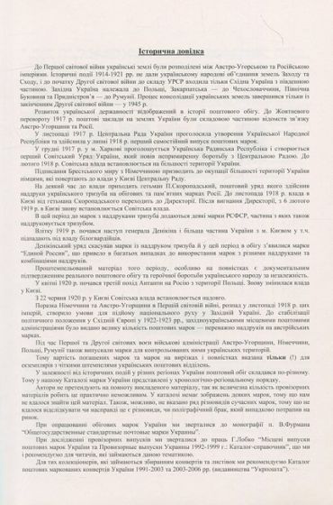 Каталог містить інформацію про обіг поштових марок в Україні з 1850 року, коли чимало її сучасних регіонів входило до складу Австро-Угорської та Російської імперій, а пізніше – Речі Пополитої. Розглядається також і пошта під час окупації території нашої країни у Першій та Другій світових війнах. Окремий розділ присвячений поштовим маркам, які випускалися на Україні впродовж 1915–2009 років.
