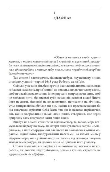 ХVII століття, час Великих географічних відкриттів. Роберто де ла Грів вирушає на кораблі у навколосвітню подорож. Однак шторм руйнує його плани, і після кораблетрощі він потрапляє не на безлюдний острів, як Робінзон Крузо, а на «Дафну» — корабель, що застряг на мілині в лагуні невідомого острова у Тихому океані, де, на перший погляд, нікого немає. Там він згадує своє минуле, сповнене дивовижних пригод: участь у Тридцятилітній війні, сидіння в облозі у місті, яке намагалися захопити іспанці, дружбу з дворянином-атеїстом, життя у Парижі, де на нього чекали і кохання, і алхімія, і Рішельє з Мазаріні... Роман містить чимало цитат з книжок відомих та не дуже популярних, у ньому повно сюрпризів для здогадливих читачів, що надає йому особливої привабливості.