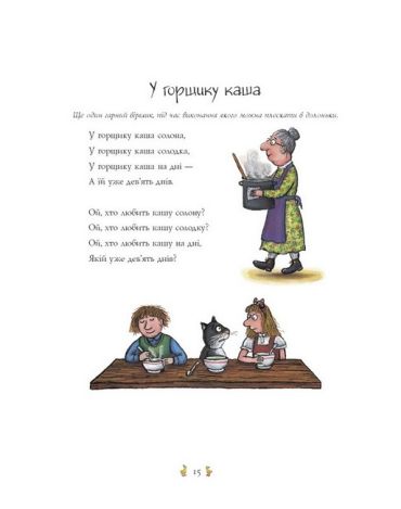 Відома на увесь світ збірка “Пісеньки та віршики матінки Гуски” містить традиційні британські пісеньки та віршики, які чудово підходять для спільного читання та веселого проведення часу. В неї увійшли такі творіння як “Три маленькі киці”, “Шалам-Балам”, “Інсі Вінсі павучатко” та багато інших.