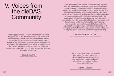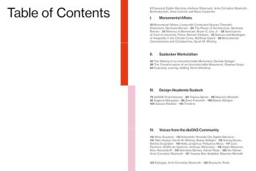 dieDASdocs: Монументальні справи_Життя в суперечливих просторах - це перша публікація Академії дизайну dieDAS - Saaleck. Цей перший том нової серії представляє результати циклу стипендій dieDAS 2023 року під художнім керівництвом відомої американської архітекторки Джерман Барнс, а також подальшого саміту dieDAS walk + talk, які разом заглибилися у складну історію пам'ятників та їхній зв'язок з нагальними глобальними проблемами, такими як расизм, націоналізм, соціальна нерівність та кліматична несправедливість. Крім того, видання розповідає історію dieDAS-Design Akademie Saaleck до сьогоднішнього дня через есе, інтерв'ю та заяви, які окреслюють бачення та інноваційний дух академії, а також знайомлять з багатьма дизайнерами, архітекторами, критиками, активістами та іншими особами, які відігравали і продовжують відігравати роль у її розвитку.