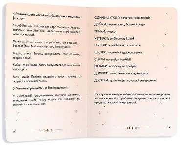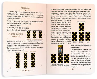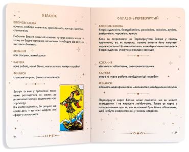 - пояснення структури колоди та детальний опис кожної з 78 карт, включно з ключовими словами та значеннями карти в прямій та перевернутій позиції