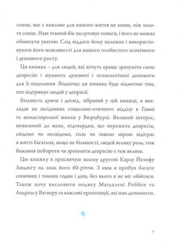 Ця книга буде доброю допомогою тим, хто хоче краще зрозуміти свій психологічний стан і шукає духовної та психологічної підтримки. Водночас книга допомагатиме тим, хто підтримує людей у депресії – в родині, у близькому оточенні, у психотерапевтичній практиці тощо.