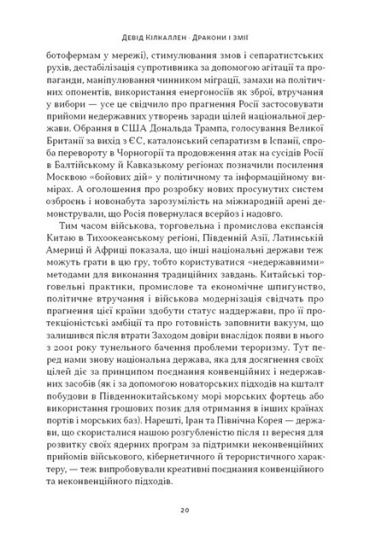 У «Драконах і зміях» військовий, вчений та експерт із зовнішньої політики Девід Кілкаллен з’ясовує, чого навчилися противники Заходу за останні 30 років. Поєднуючи еволюційну теорію та детальні польові дослідження, він пояснює, що сталося зі «зміями» — недержавними загрозами, зокрема терористами і партизанами. Водночас показує адаптацію «драконів» — таких держав-конкурентів, як Росія, Китай, Іран, Північна Корея.