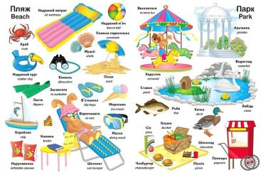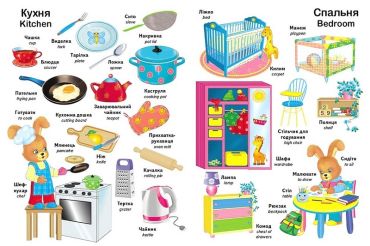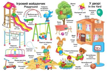 Кухня. Спальня. Ігровий майданчик. У дворі. Ванна кімната. Вітальня. Іграшки. Фрукти та ягоди. Овочі. Пляж. Парк. Продукти. Одяг. Хто як говорить? Хто де живе?