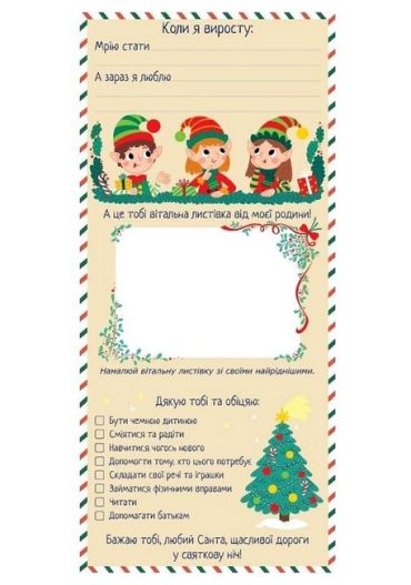 Чудовий подарунок до зимових свят для малечі – «Лист Санта Клаусу». Адже це не просто лист, а цікаві завдання та улюблений герой. Малеча розповість про себе, визначиться з подарунком, допоможе Санті знайти свій дім, а також запланує хороші справи на наступний рік. А для того, щоб Санта точно знав про твоє бажання і доставив подарунок саме до твоїх дверей, необхідно завчасно попередити його. Тож беріть найяскравіші фломастери й олівці, покладіть лист перед собою і почніть заповнювати його!