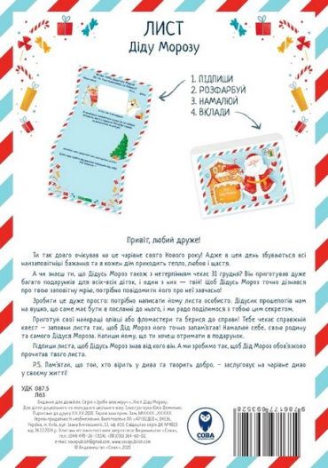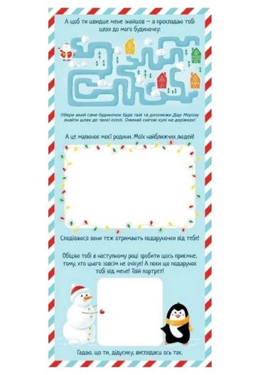 Кожна дитина з трепетом чекає на чарівне свято – Новий рік! Адже саме у цей день усі найзаповітніші мрії здійснюються! «Лист Діду Морозу» це справжнє диво та ідеальний подарунок дитині перед Новим роком. Малеча розгадуватиме лабіринти і зможе подумати над тим, які хороші справи робитиме наступного року. Він сподобається навіть найменшим, адже у віконцях не обов’язково писати, а можна просто намалювати подарунок мрії. Дід Мороз приготував багато подарунків для всіх діток, і один із них – твій! А для того, щоб Дідусь точно знав про твоє бажання і доставив подарунок саме до твоїх дверей, необхідно завчасно попередити його. Тож беріть найяскравіші фломастери й олівці, покладіть лист перед собою і почніть заповнювати його!