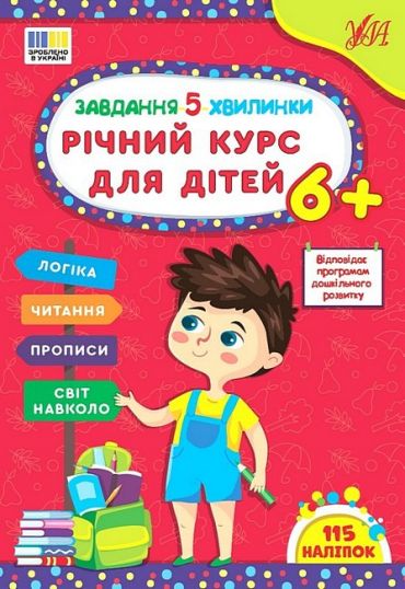 Тоді вам точно сподобається книжка «Річний курс для дітей 6+», яка відповідає програмам дошкільного розвитку й містить річний курс для малят від 6 років. Видання охоплює чотири напрямки підготовки: логіку, читання, прописи та світ навколо. Виконуючи ігрові завдання, дитина розвине логічне мислення, увагу та пам’ять; потренує мовленнєві навички, попрактикується читати слова, словосполучення, речення і прості тексти; розвине навички дрібної моторики, наводячи по пунктиру лінії, фігури, цифри й букви, а також навчиться орієнтуватися в просторі й закріпить знання про овочі, фрукти, звірів, птахів, рослини, транспорт, місяці й пори року, корисне дозвілля й харчування, правила безпеки й дорожнього руху тощо. Виконання завдань передбачає використання наліпок, що урізноманітнить роботу з завданнями й створить ігрову атмосферу.