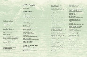 Книга містить чотири розділи. «Сади ідей» переходять від політично алюзійних садів Англії 18-го століття, створених такими людьми, як Вільям Кент, до шотландського саду Чарльза Дженкса, натхненного космографією 21-го століття. «Сади прямих ліній» досліджують життя великих садівників-формалістів, від Le Notre у Версалі до раціонального англійського мінімалізму сучасного дизайнера Крістофера Бредлі-Хоула. «Сади кривих» починається з видатного представника англійського ландшафтного саду, «Capability» Брауна, і веде до надзвичайного бразильського дизайнера Роберто Бурле Маркса. Нарешті, «Gardens of Plantsmanship» переходить від батька натуралістичного садівництва Вільяма Робінсона до широких прерій улюбленого голландського дизайнера Нью-Йорка Піта Удольфа.