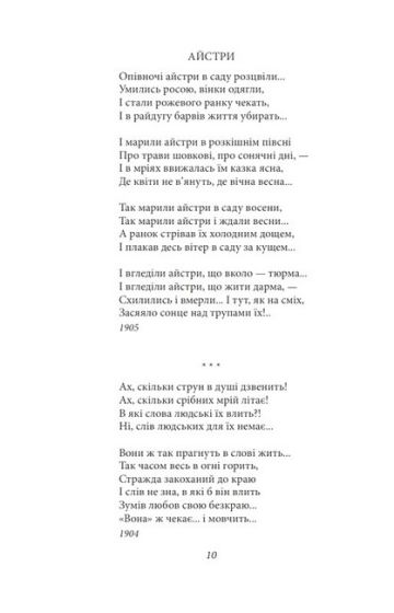 До цього видання ввійшли оригінальні поетичні твори зі збірок різних років Олександра Олеся (Олександра Івановича Кандиби, 1878–1944) — українського поета, драматурга, представника символізму. Навчився читати у чотири роки, а дядько Василь, з яким жили в одній хаті, прилучив хлопчика до творів Т. Шевченка, П. Куліша та Марка Вовчка. У 15-річному віці вступив до хліборобської школи, де брав участь у випуску рукописних часописів, в яких з'явилися його перші вірші. Свої твори публікував під псевдонімом. З 1924-го жив у Празі, а коли Гітлер розчленував Чехословаччину, перейнявся долею сина Олега Ольжича, якого в червні 1944 року закатували в концтаборі Заксенгаузен, після чого серце поета не витримало.