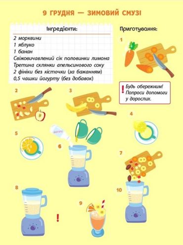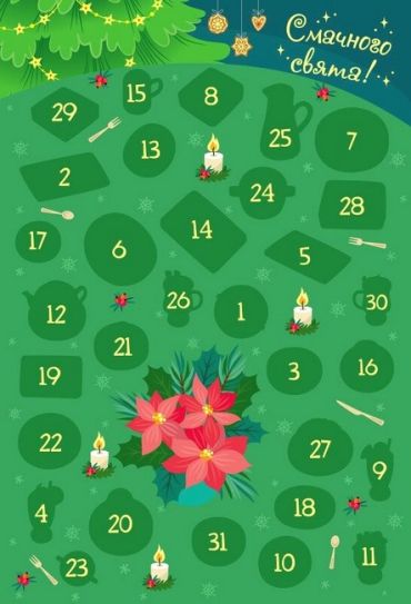 Адвент “Накриваємо на стіл” – для всіх любителів кулінарного чародійства. Календар містить 31 смачний та простий рецепт на кожен день очікування свята. Можна готувати разом з дітьми та створювати свої власні сімейні традиції. До складу входить основа-святковий стіл, куди щодня додається одна наліпка з приготованою стравою. Смачного й теплого настрою!