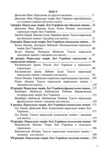 До навчального посібника ввійшли статті про переклади творів Лесі Українки європейськими та східними мовами, вибрані переклади англійською, німецькою, шведською, норвезькою, французькою, іспанською, польською, чеською, російською, сербською, грузинською, китайською мовами та мовою есперанто, а також оригінали і завдання для аналізу. Його матеріали можна використати в курсах теорії та практики перекладу художніх текстів, перекладознавчого аналізу тексту, літературного редагування перекладів, лінгвістичного аналізу тексту, загального і зіставного мовознавства, інтерлінгвістики, соціолінгвістики, міжкультурної комунікації та інших.