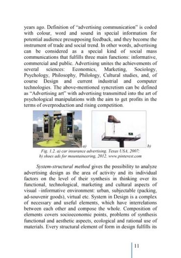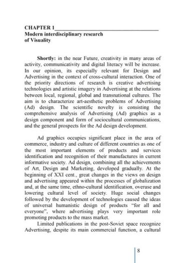 Авторка розглядає плакат в контексті сучасного рекламного дизайну як специфічного виду творчої діяльності – процес проєктування представлено як синтез соціокультурних, ідеологічних, кольоро-графічних і маркетингових аспектів. Проаналізовано вагомий вплив мистецьких стилів на рекламну графіку, проблеми візуалізації рекламних ідей, структуровано арсенал художньо-графічних засобів у сукупності з комп’ютерними технологіями. Окрему увагу присвячено асоціативному сприйняттю кольору в рекламних зверненнях та його смисловим інтерпретаціям.