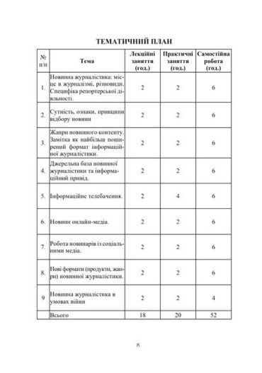 Призначений для здобувачів вищої освіти галузі знань «Журналістика» з метою закріплення лекційного матеріалу і підготовки до практичних занять з дисципліни «Новинна журналістика».