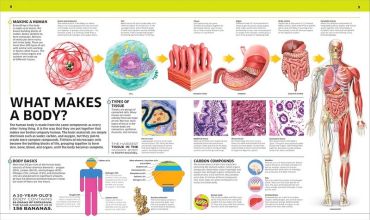 -Наповнений фактами, діаграмами, інфографікою та ілюстраціями, які охоплюють тіло людини з ніг до голови.