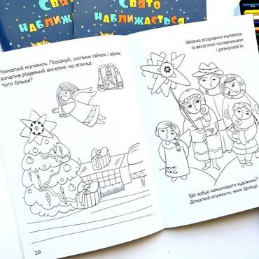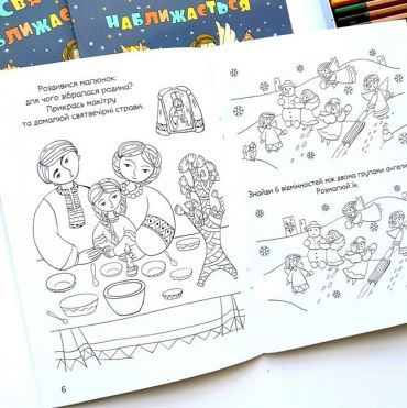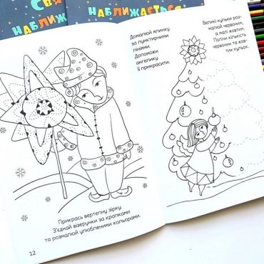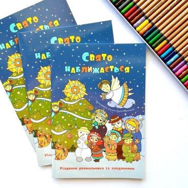 Пропонуємо розмальовку різдвяної тематики для дітей 4+ років. Окрім розмальовування ялинки, св Миколая тощо дітям запропоновані цікаві завдання: домалювати малюнок (за пунктиром) або намалювати свій; знайти на малюнку певні речі; знайти відмінності у двох схожих малюнках; розмалювати різними кольорами кульки на ялинці, що мають різну форму, та інші.