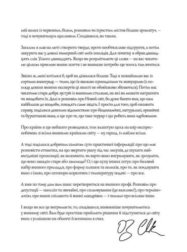 Провідний винний експерт Оз Кларк, як завжди, легко і з гумором говорить із читачами про найважливіші тонкощі вибору вина, а головне — про вміння по-справжньому насолоджуватися цим унікальним напоєм. Крок за кроком, з кожним розділом цієї книжки ви відкриватимете для себе світ вина з усіма його принадами. Почніть з основ (які бувають сорти винограду й стилі, у чому їх особливості і як орієнтуватися на мапі виноробних країн світу), тоді попрактикуйтеся (як правильно читати етикетку, де краще купувати вино, у що наливати і з якою їжею поєднувати) і нарешті — відчуйте себе справжнім фахівцем, засвоївши кілька простих правил дегустації та професійну лексику винолюба. У цій книжці немає сухих фактів і нотаток сноба-сомельє, вона більше нагадує приємну, корисну і не завжди серйозну розмову з обізнаним другом, який радо розділить з вами пляшку гарного вина.
