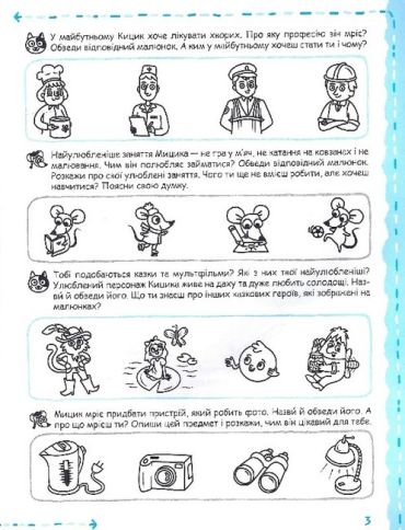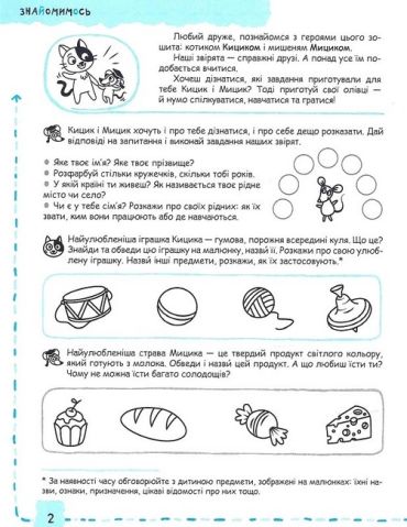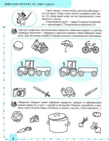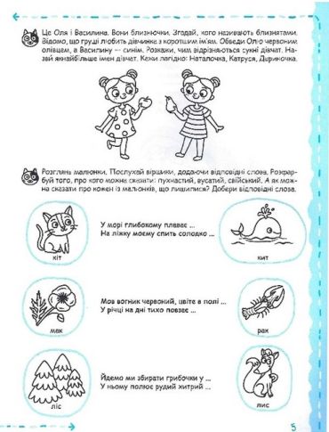 Посібник містить необхідний теоретичний матеріал, а також сучасні, цікаві, доступні, актуальні завдання, скомпоновані за принципами цілісності, системності, послідовності, поступового ускладнення, закріплення та повторення матеріалу. Зошит укладено за чинним Базовим компонентом дошкільної освіти та програмами розвитку дитини. До завдань із розвитку мовлення та навчання грамоти входить матеріал із природознавства, підготовки руки до письма, логіки, суспільствознавства тощо. Герої зошита, котик та мишеня, перетворять заняття на веселу й цікаву гру.