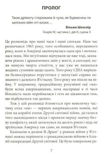 Якщо битва на Соммі започаткувала еру танків, то битва у долині ріки Я-Дранґ випробувала вогнем теорію аеромобільних військ. Завдяки фаховим знанням генерала Гаролда Мура та літературному хисту журналіста Джозефа Ґелловея, учасників цієї битви, тактичні міркування, вплив політики на стратегію, особливості застосування озброєння та інші аспекти мілітарної справи набувають зрозумілих форм, складаючись у виразну картину не лише окремої битви, але й війни у В’єтнамі загалом. Книга, за мотивами якої був створений однойменний фільм, адресована військовослужбовцям, волонтерам, дослідникам воєнної історії, усім, хто цікавиться військовою справою та вивчає вплив війни на наше життя.