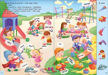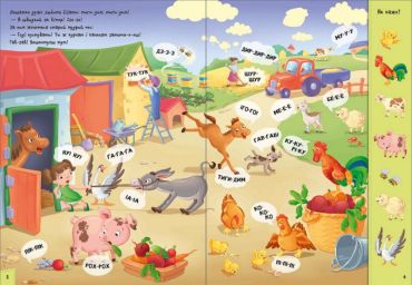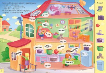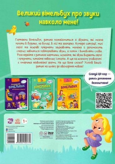 Гортаючи вімельбух, дитина познайомиться зi звуками, якi можна почути в будинку, на вулицi, в лiсi та зоопарку. Кумеднi ситуацiї, милі герої та яскраві предмети зацiкавлять малюка й допоможуть спершу навчитися повторювати звуки, а потiм i вимовляти слова. Розглядайте з дитиною картинки, шукайте, якi звуки видають герої i предмети, читайте невелику iсторiю. А ще на кожному розворотi є хмаринка незвичайної форми. На що вона схожа?