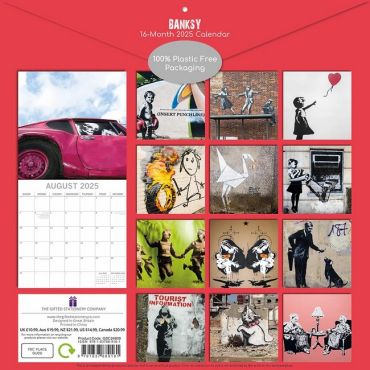 This 2025 Banksy Square Wall Calendar covers 16 months- starting September 2024 and ending December 2025 (the last four months of 2024 are mini-sized). With a monthly view where the week starts on Sundays. It is carefully shrink-wrapped and displays the image at the top, and the day-by-day month below it.