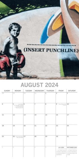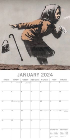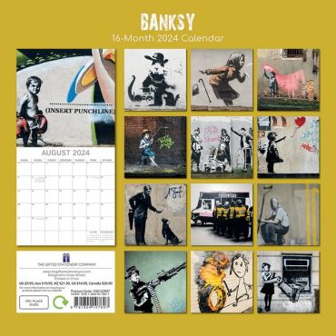 This 2024 Banksy Square Wall Calendar covers 16 months- starting September 2023 and ending December 2024 (the last four months of 2023 are mini-sized). With a monthly view where the week starts on Sundays. It is carefully shrink-wrapped and displays the image at the top, and the day-by-day month below it.