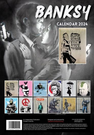 This 2024 Banksy A3 sized calendar featuring photographs of Banksy published by Call Dream International is the ultimate gift for any Banksy fan. The date grid of the 2024 Banksy A3 Wall Calendar is fairly small, which was done on purpose to maximize the size of your celebrity, since, let's face it, what are you more excited about, the dates or the celebrity?