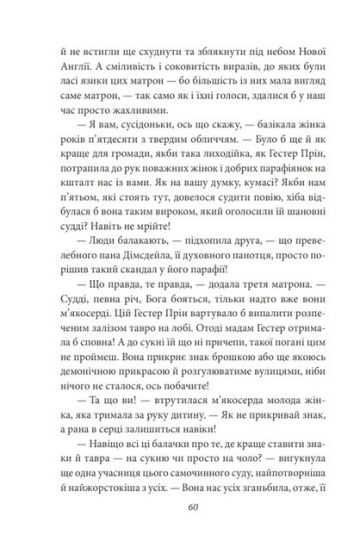Незаперечною перлиною у творчій спадщині відомого американського письменника Натаніеля Готорна є глибокий психологічний роман «Багряна літера». Проте на батьківщині письменника далеко не всім нащадкам пуритан сподобалося те, як він показав духовне життя їхніх і своїх предків, що жили в середині XVII століття, як розвінчав їхню сувору нетерпимість, жорстокість, збочені уявлення про гріх і справедливість. Справді, історія, здавалося б, звичайної подружньої зради Гестер Прін стала повчальною драмою, з якої головна героїня, хай і зазнавши важких випробувань, виходить незламною, бо в її серці є те, що не має піддаватися жодному осуду, — справжнє кохання.