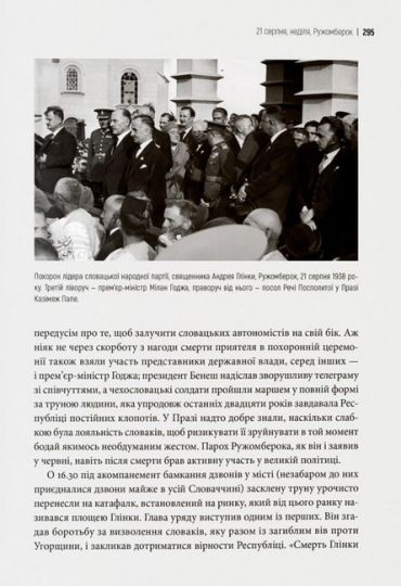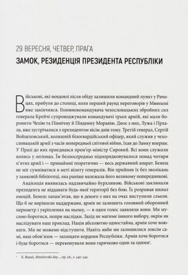 Пйотр М. Маєвський майстерно аналізує міжнародну кризу, у яку світ занурився напередодні Другої світової війни. Ледь не щоденна реконструкція подій, надзвичайна увага до деталей, залаштункові розмови політиків у Празі, Берліні, Римі, Лондоні та деінде, протистояння розвідок, аналіз психотипів головних дійових осіб, їхня сила та безсилля витворюють динамічний сюжет, у якому напруга зростає із кожною сторінкою. Тут немає довгих розділів, оповідь радше нагадує щоденник, у якому кожен запис побудовано довкола важливих місць, людей та подій. Читач стає очевидцем і разом з протагоністами переживає увесь буремний 1938 рік, опиняючись у вирі політичного трилера, на жаль, з відомим фіналом.