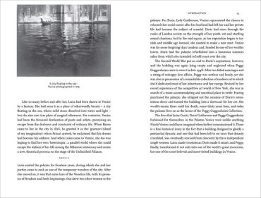 Кожна з них використовувала недобудований палаццо як сцену, на якій переосмислювала своє життя, залучаючи до цього сліпучий акторський склад - від Д'Аннунціо і Ніжинського, Ноеля Коварда, Вінстона Черчилля і Сесіла Бітона до Йоко Оно. Сенсаційні індивідуально і чудові колективно, ці історії сучасної Венеції розповідають нам багато про те, як жінки обирали спосіб життя у 20-му столітті.