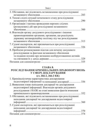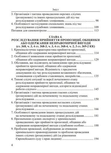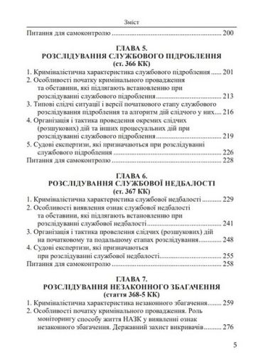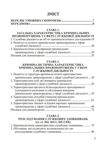 Викладено криміналістичні та процесуальні аспекти розслідування основних видів кримінальних правопорушень у сфері службової діяльності: службових зловживань, прийняття пропозиції, обіцянки або одержання неправомірної вигоди, службового підроблення, службової недбалості, незаконного збагачення, неподання декларації, декларування недостовірної інформації.