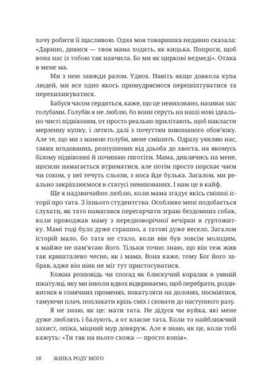 Роман «Жінка роду мого» — сага про життя чотирьох поколінь на тлі історичних подій в Україні, що охоплюють 1928—2023 роки. Наша історія рухається по спіралі: ті ж вороги, що відібрали юність і свободу Ганни століття тому, розпочали широкомасштабну війну тепер, коли Дарина насолоджується студентськими роками. Зрештою, навіть відносно спокійне життя Дарининих бабусі й мами лише напозір благодатне, бо бути українцями під совєтською окупацією непросто, часом небезпечно.