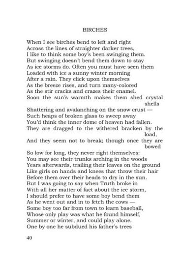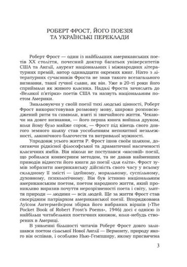Перше в Україні видання окремою книгою поезії одного з найбільших американських поетів ХХ століття Роберта Лі Фроста (1874–1963) містить його вибрані твори та українські переклади, які здійснили поети-перекладачі Валерій Бойченко, Валерій Кикоть, Валерій Корнєєв, Віталій Коротич, Євген Крижевич, Віктор Марач, Дмитро Павличко, Максим Стріха, Остап Тарнавський. До більшості творів подано фаховий коментар.