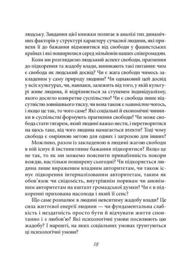 Основоположник психоаналізу Зиґмунд Фройд говорив: «Більшість людей насправді не хочуть свободи, тому що вона передбачає відповідальність, а відповідальність лякає людей». Може, тому втеча від свободи цілком прийнятна для більшості? Еріх Фромм розкриває перед читачем саму суть свободи, чим вона є для сучасної особистості. Чи існує зв’язок між авторитарними режимами та втечею від свободи? Як пояснити той факт, що деякі люди добровільно відмовляються від незалежності, віддаючи перевагу рабству й обираючи конформізм? Чому свобода може спричиняти почуття самотності, страху та безсилля? І чи справді свобода має дві форми — хорошу й погану? Еріх Фромм розглядає феномен свободи і відповідає на ці одвічні питання.