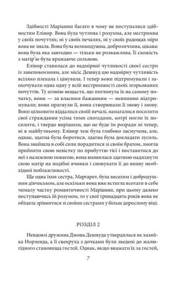Світ творів англійської письменниці Джейн Остін (1775—1817) є світом звичайних чоловіків і жінок, доволі буденним, розміреним і в той же час не позбавленим драматизму. Тонкий психолог і знавець людського серця, письменниця створила надзвичайно виразні й правдиві образи. Її герої — живі люди, з усіма їх достоїнствами і недоліками, здатні і на високі почуття, і на великі помилки. Доля Маріанни Дешвуд, героїні роману "Чуття і чутливість", стала запереченням розхожих уявлень того часу про романтичну пристрасть як вершину людських почуттів. Зазнавши зради коханого, Маріанна переконалася, що навіть таке високе почуття, як любов, повинно засновуватися на благородстві, щирому серці та вмінні зрозуміти іншу людину.