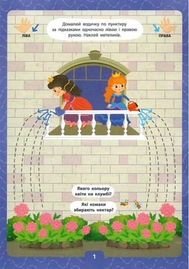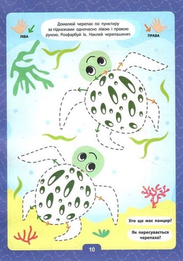 Ця книжка допоможе дитині навчитися наводити по пунктиру одночасно обома руками прості малюнки: кульки, квіти, метелики, печиво, будинки, тварин і птахів тощо. Кольорові стрілочки підкажуть, що потрібно наводити правою рукою, а що — лівою. Наліпки урізноманітнять роботу з виданням, а додаткові питання допоможуть розвинути мовлення, потренувати пам'ять та увагу.
