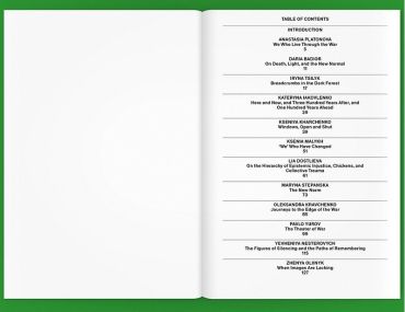 У десяти есеях автор та авторки описують, як їм довелося покинути рідну домівку й віднайти себе наново в інтелектуальному та професійному планах. Вони говорять про те, що означає бути очевид:ицею війни, і намагаються поділитися цим радикальним досвідом з людьми за межами України.