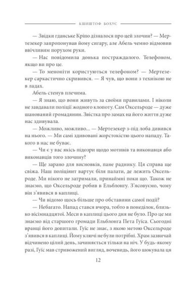 …1934 рік. Після жорстоких тортур до лікарні потрапляє шанований лідер менонітської громади. Слідчий Кристіан Абель ще встигає застати нещасного живим, проте той не сказав ані слова: нападник позбавив його язика. Чим завинив перед злочинцем очільник хай і закритої від суспільства, але законослухняної спільноти? І чому це розслідування могло вартувати життя самому Кристіану, якби вірний вахмістр Зозулька не відвернув загрозу?