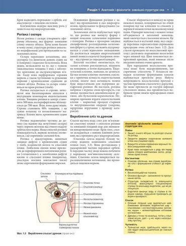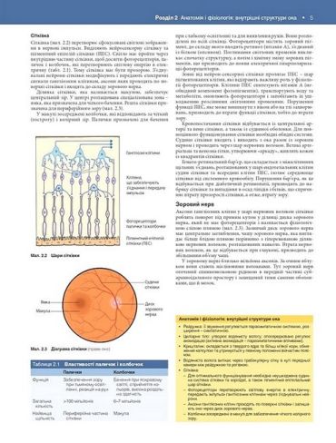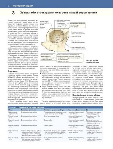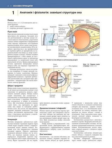 Матеріал у книзі розділено на чотири частини. Перша частина містить основні відомості з анатомії та фізіології очей. Другу частину присвячено офтальмологічним захворюванням. Матеріал тексту переважно впорядковано за анатомічною структурою. У третій частині викладено спеціальні теми, пов’язані з захворюваннями та клінічним лікуванням. Останню частину присвячено вирішенню клінічних проблем.