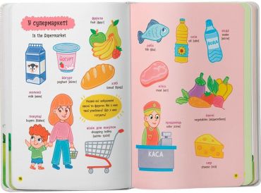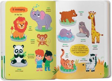 Ця книжка допоможе дитині в ігровій формі засвоїти нові слова, навчитися чітко та правильно їх вимовляти, а також сприятиме розвитку логічного мислення та вивченню навколишнього світу. На кожному розвороті малюк бачитиме великі кольорові малюнки, запам’ятовуватиме нові слова, відшукуватиме задані предмети, відповідатиме на запитання. Підписи в книжці подано двома мовами, що зробить вивчення англійської легким і веселим навіть для найменших.