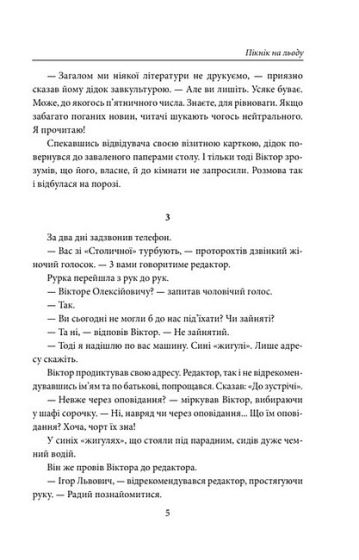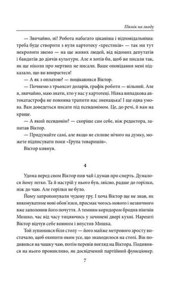 Головний герой роману «Пікнік на льоду» — журналіст Віктор Золотарьов — отримує незвичайне завдання від провідної газети: писати некрологи про впливових людей, які поки що живі. Поступово він усвідомлює, що з необережності опинився втягнутим у складну гру тіньових структур. І тепер йому доводиться боротися за те, щоб просто вижити. Але ситуація ускладнюється через пінгвіна на ім’я Мишко. Віктор забрав його з Київського зоопарку, тому що в них не вистачало грошей на годування тварин.